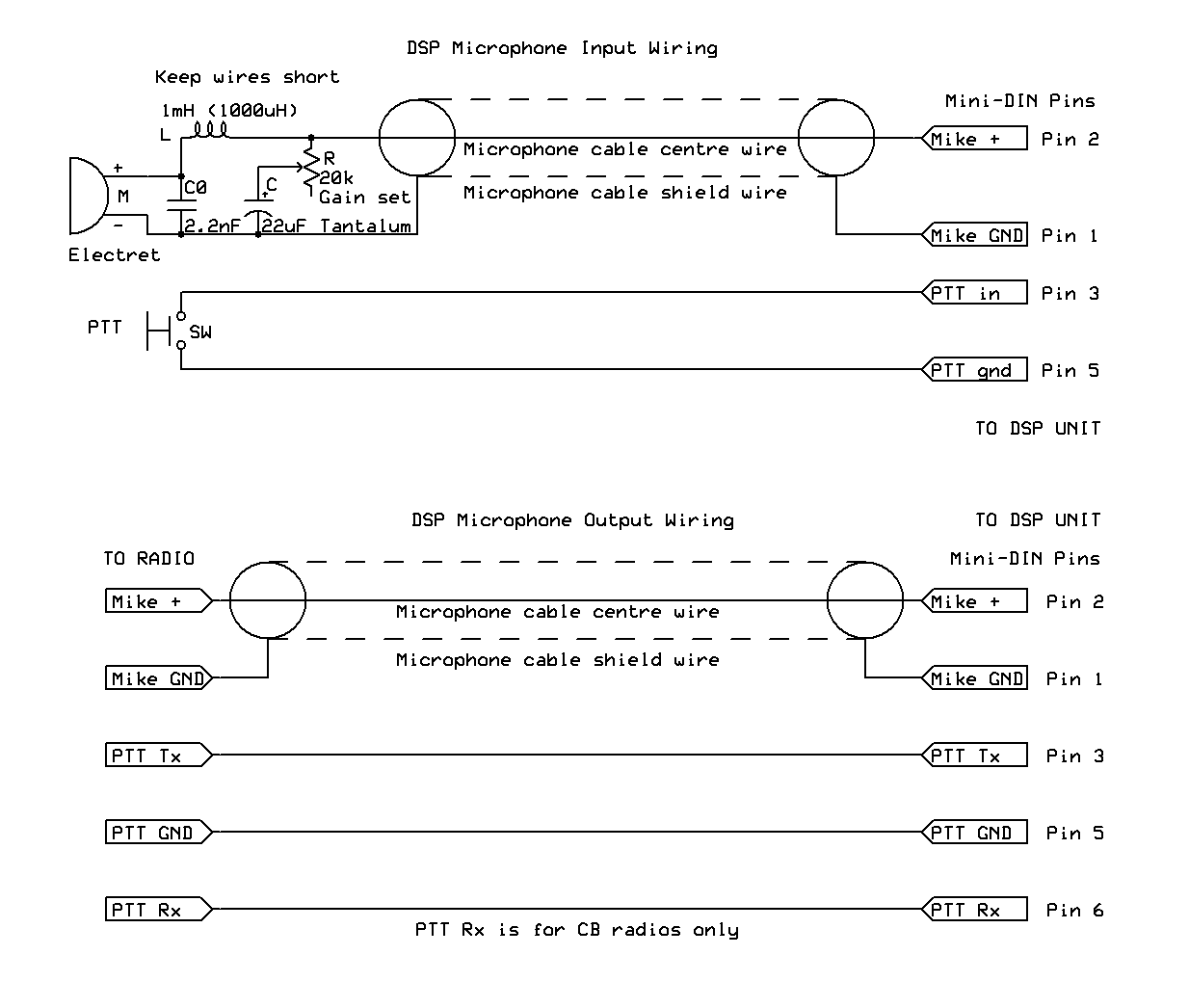 Transceiver microphone fly leads will need to be made to suit the transceiver. Consult your transceiver schematic diagram for the microphone wiring. The transceiver microphone lead goes to the mini-DIN socket nearest the DC Power connector, and the input microphone lead goes to the mini-DIN socket furthest from the DC Power connector.