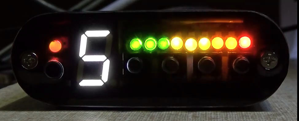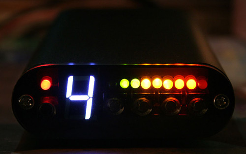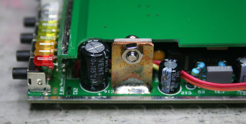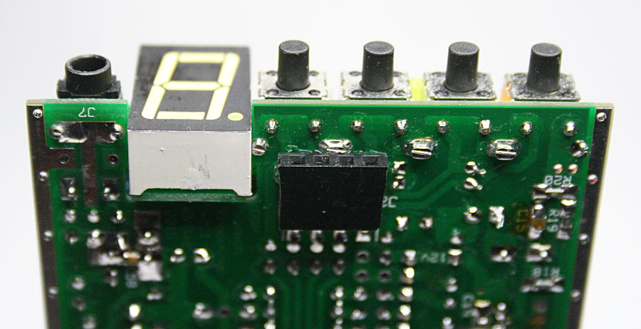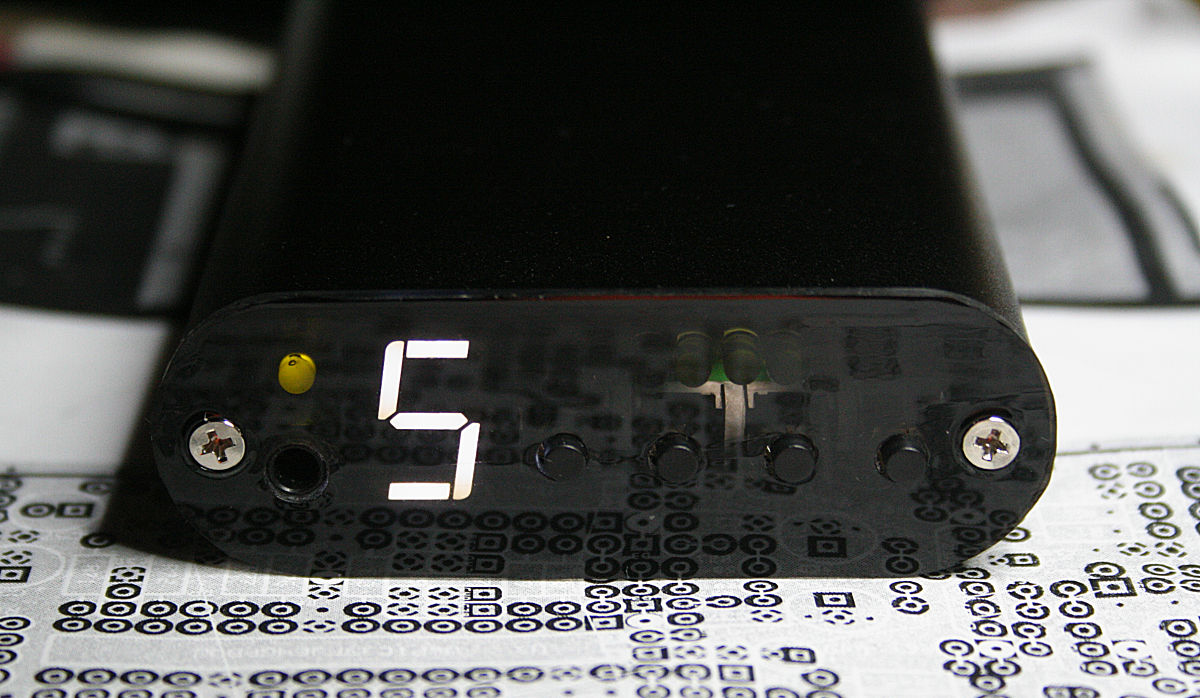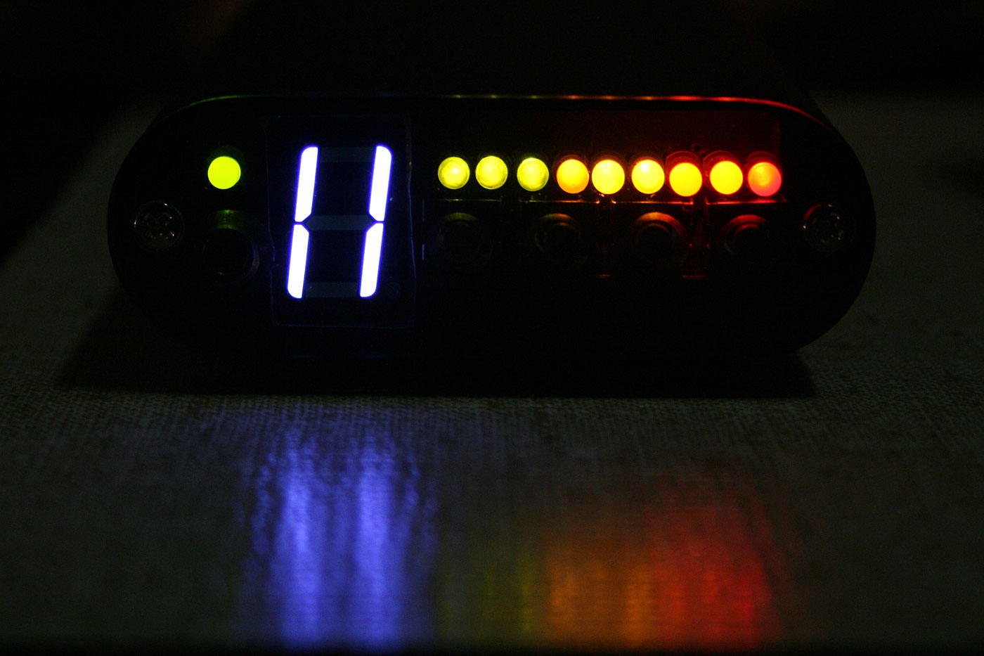 The green bargraph LEDs are superbright water-clear types to match the brightness of the other LEDs. They were made diffused by roughening the front surface with fine sandpaper.