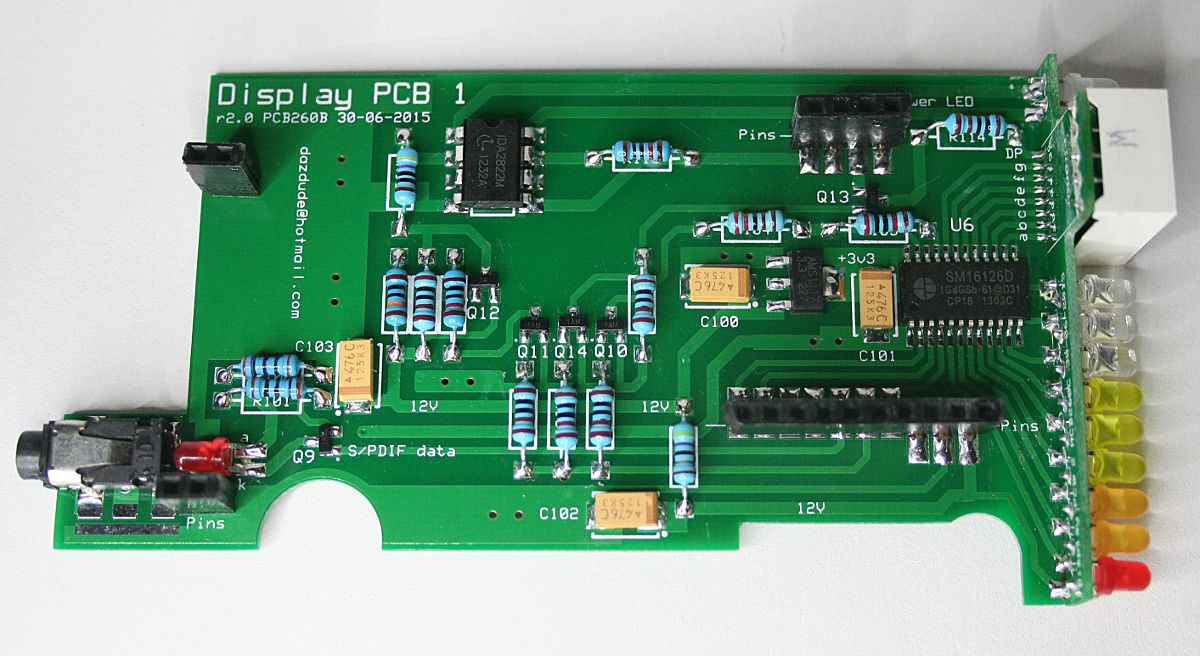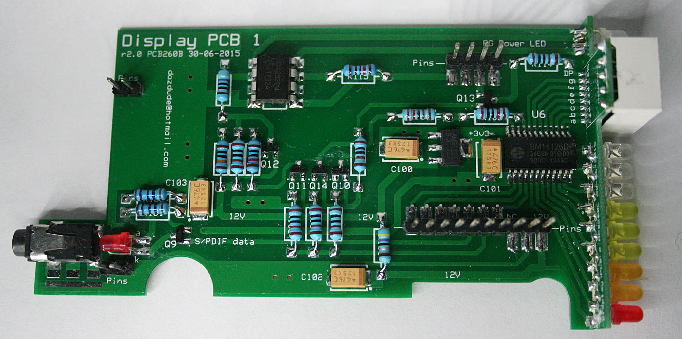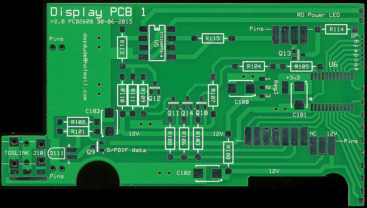 for the R/G LED, a TOSLINK digital audio output driver circuit, and assorted