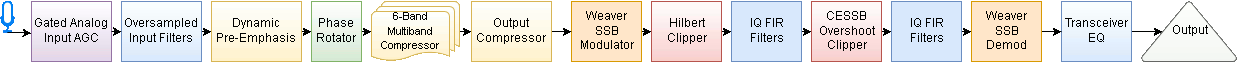 Some Speech Processing TheoryThe difference between the quietest and loudest dB levels in an audio signal is referred to as its "Dynamic Range".Due to the large dynamic range of unprocessed speech (greater than 30 dB according to various references), speech processing is widely used to reduce this range for consistent modulation. This is especially important for broadcasting and communication where the maximum peak level is limited by the maximum transmitter power level or the defined modulation standard. Both compression and peak clipping are used to reduce the dynamic range of audio content in these applications. AM and SSB systems have a flat noise spectrum, because they respond equally to noise across the passband. The unprocessed voice has a bass heavy spectrum, as the fundamental and low harmonics of the vocal cords are far stronger than the higher harmonics. FM systems have a noise spectrum that rises with frequency. Pre-emphasis is used in both AM/SSB and FM systems to compensate for these factors. "Loud, bright, clean - pick any two" is a well known choice in FM broadcasting. This is because the receiver de-emphasis makes low frequencies sound louder. To increase brightness, less bass energy is available - reducing loudness. To increase loudness, more clipping can be used which then increases distortion. Since most receivers have some type of de-emphasis or hi-cut filtering, this effect can also happen in communications gear. Multiband compressors are often used in broadcasting and music mastering applications because their action produces less undesirable effects than broadband compression (e.g. "pumping" and increased IMD). Essentially the audio spectrum is divided into bands by a filter bank, then compressed individually before being recombined - sometimes after additional filtering to suppress any compressor distortion products. The multiband compressor also has the effect of producing a more even spread of energy across the audio band, producing a flatter power spectrum. This is useful, as it matches the flat noise spectrum of SSB and AM systems. It gives all the voice frequencies a better chance of being heard above the noise floor, while maintaining a higher perceived quality. This is the approach used here. The multiband compression is teamed up with phase rotation, additional wideband compression and Hilbert clipping to significantly increase the average speech power without adding harmonic distortion, or excessive amounts of intermod distortion. This design will outperform any conventional analog processor, and any standard audio DSP processor.* With its reasonably flat audio spectrum, the processor produces a typical peak-to-average ratio of about 6dB (3kHz BW, Mode 4, clipping ON), while maintaining good quality. * Unprocessed audio
