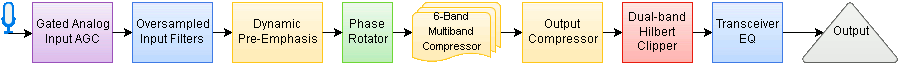 Standard audio processors do not suit Amateur radio use:* For SSB, limiting audio level does not control PEP levels accurately.* Most audio processors do not produce a flat output power spectrum required for best SNR on SSB and AM. * Most audio processors do not have the output ground loop isolation required to drive an unbalanced transceiver mike input. What this processor does right:* A Hilbert Clipper is used (IQ vectorsum controlled limiting) for best SSB PEP control.* A flat output power spectrum is produced. This matches the flat noise floor of SSB and AM. * Transceiver ground loops are prevented by using a ground loop cancellation output amplifier circuit. |