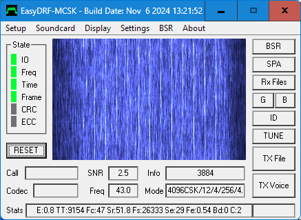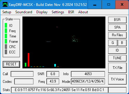 The mode being tested is 4096CSK, which has 12 bits per symbol at 8mS bauds. It appears to decode quite well at levels down to about -7dB SNR!