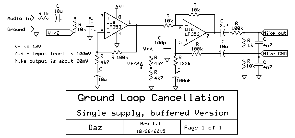 Since common OpAmps have noise levels that are too high for a mike input, the audio is amplified by U1a then scaled down again to mike level after U1b. This also improves the ground loop cancellation by an additional 30dB or more.
