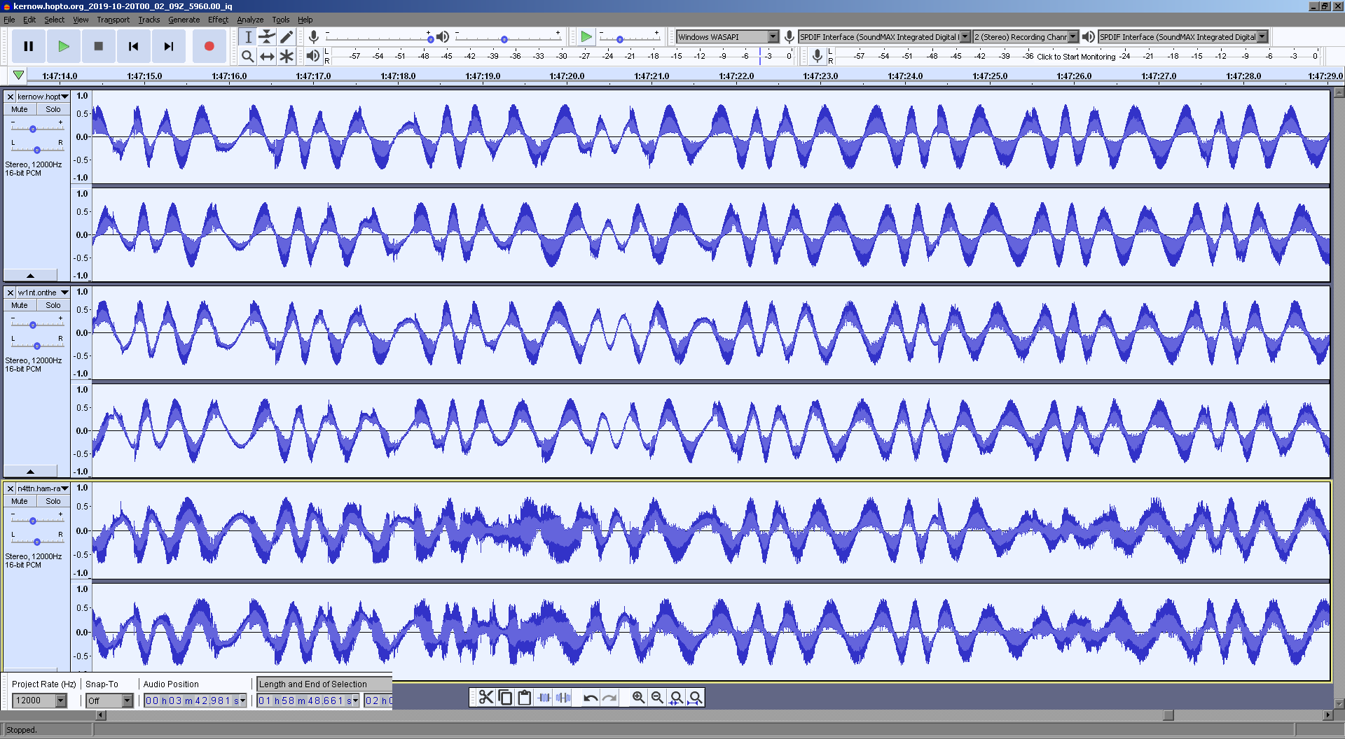 Above: Three IQ recordings from two USA and one UK KiwiSDR, all showing synchronized FM wobble on 5960kHz.
