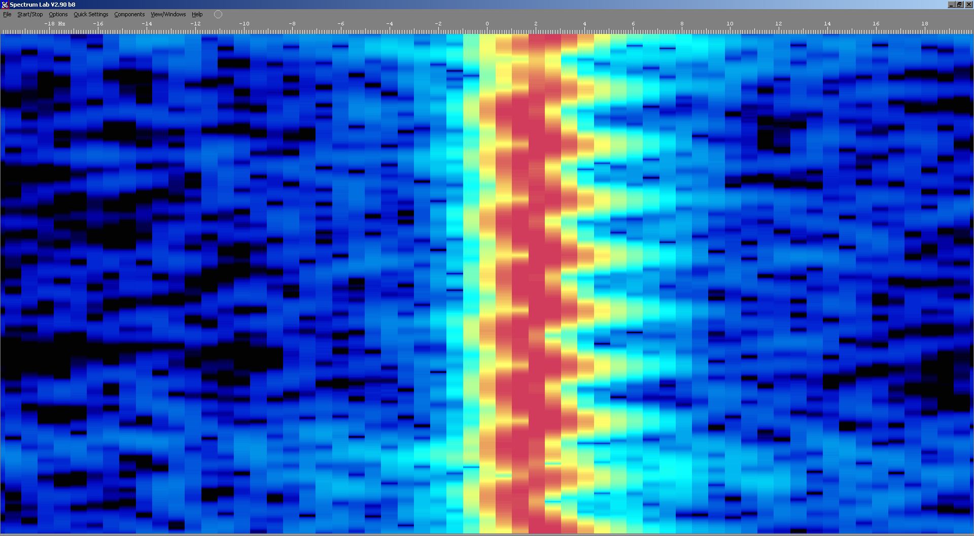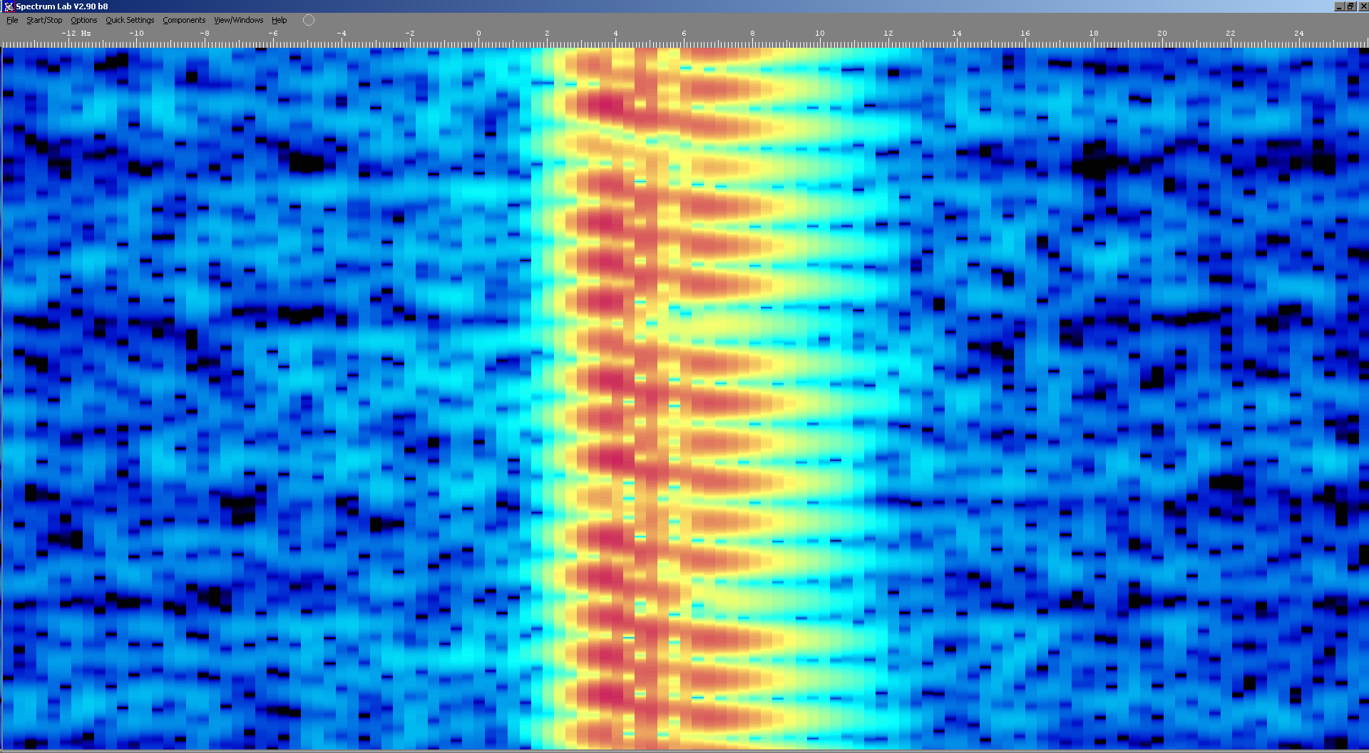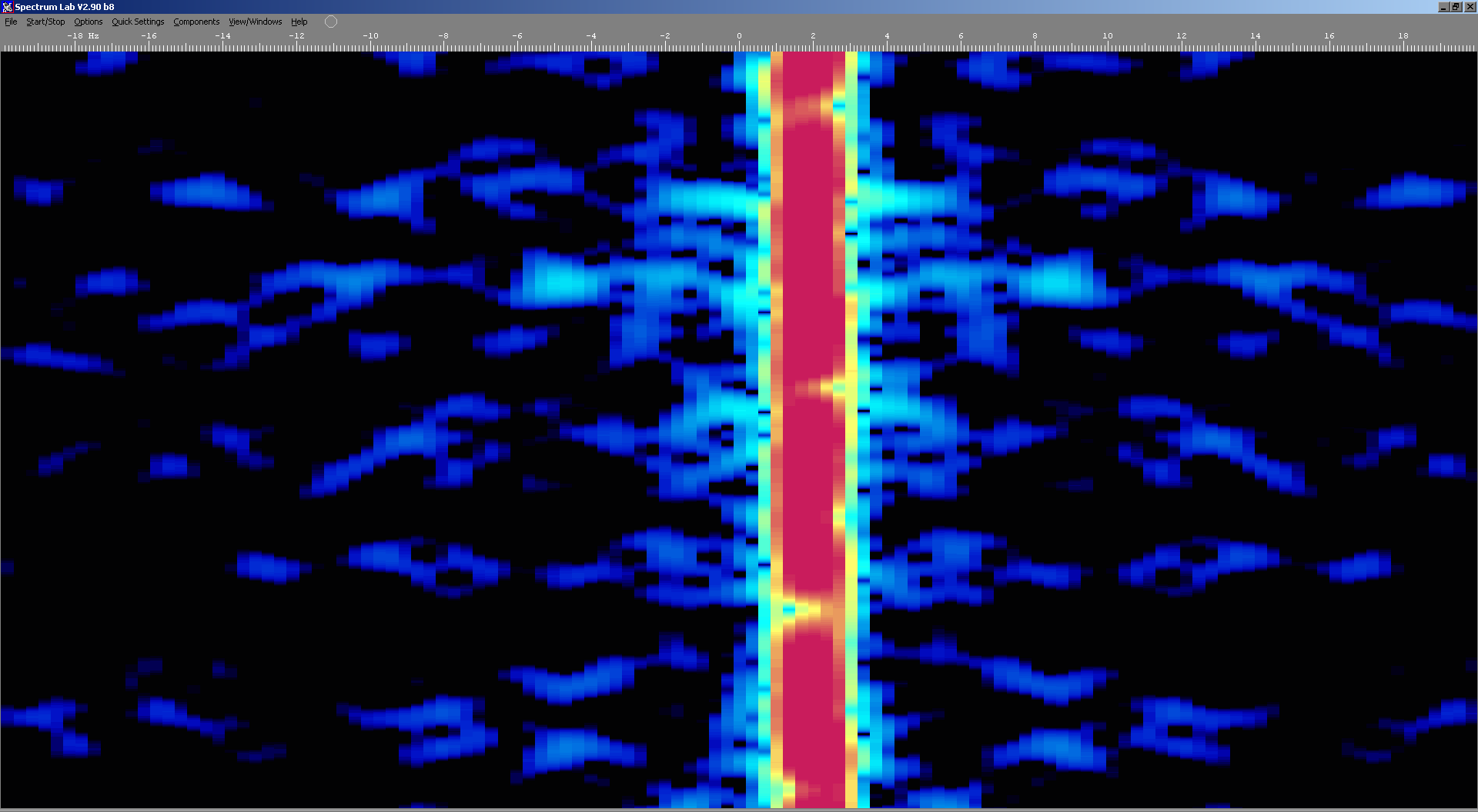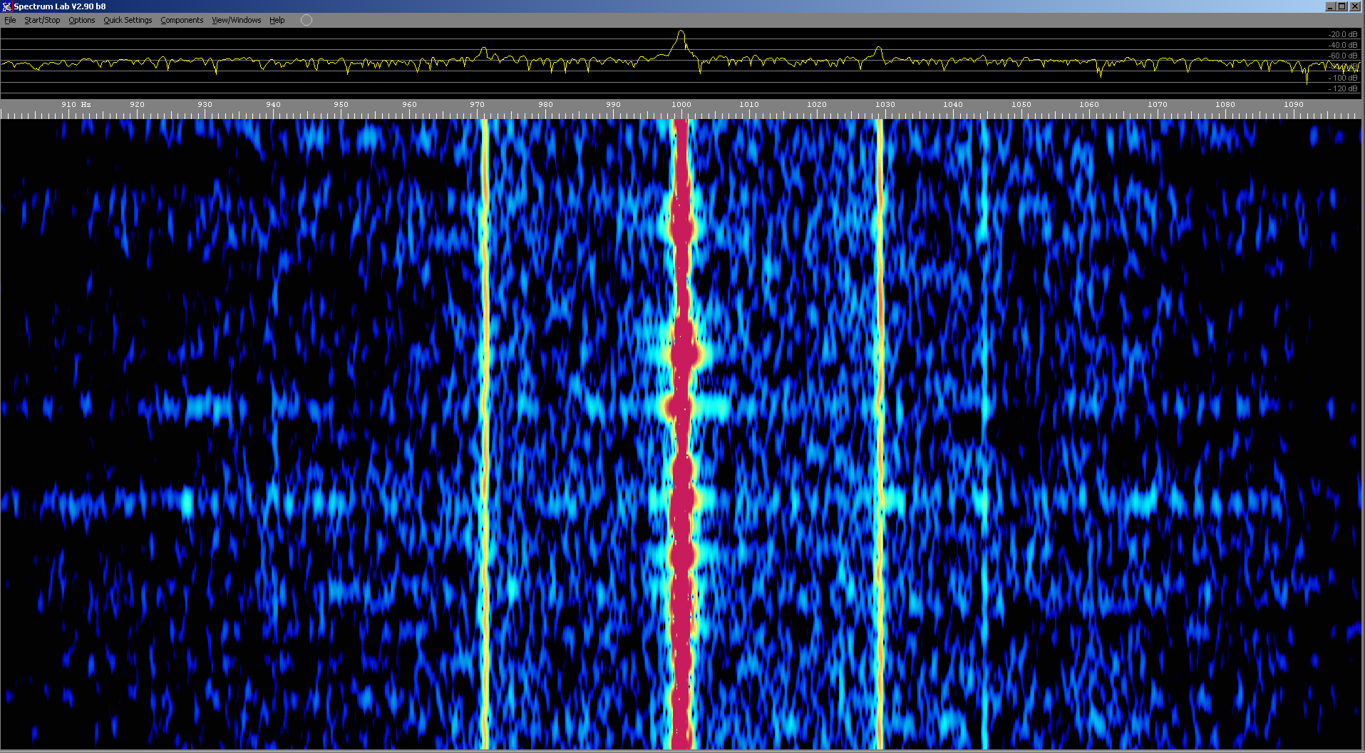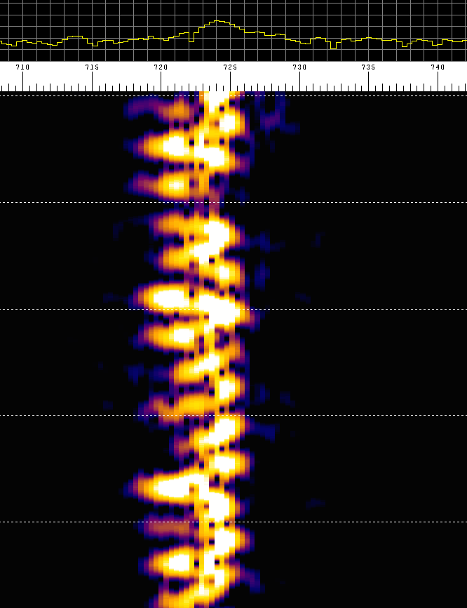 Above: Waterfall spectrum of 5850kHz captured using a Flexradio SDR showing 29Hz sidebands. |
