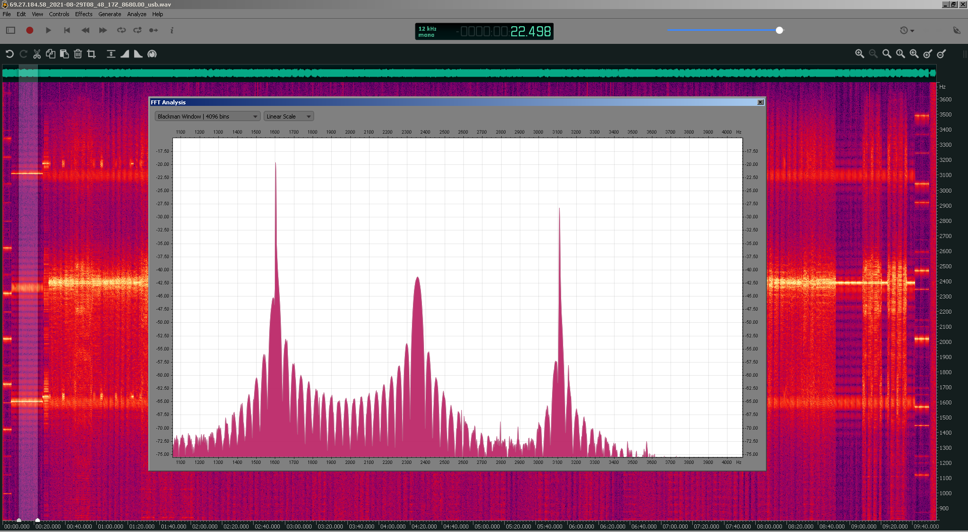 Despite being notified on April 17, 2019, the problem has not been fixed. "Our engineer is out of the country at the moment", they said. No reply to my follow-up emails. The problem continues! This fault degrades reception, and severely degrades reception using AM Sync or SSB detectors (resulting in high amounts of "rumble"). Update: November 8th, 2019. Still hasn't been fixed. Update: September 24, 2022. WINB 9265kHz was observed to be jumping off-frequency. See image at right. This suggests the synth used to generate the 9265kHz carrier urgently needs repairs or replacement. Update: October 15, 2022. WINB appears to be overmodulating during the Shortwave Radiogram program. See image at right. Also: October 15, 2022. The severe carrier phase noise has not improved. See image at right. To paraphrase the words