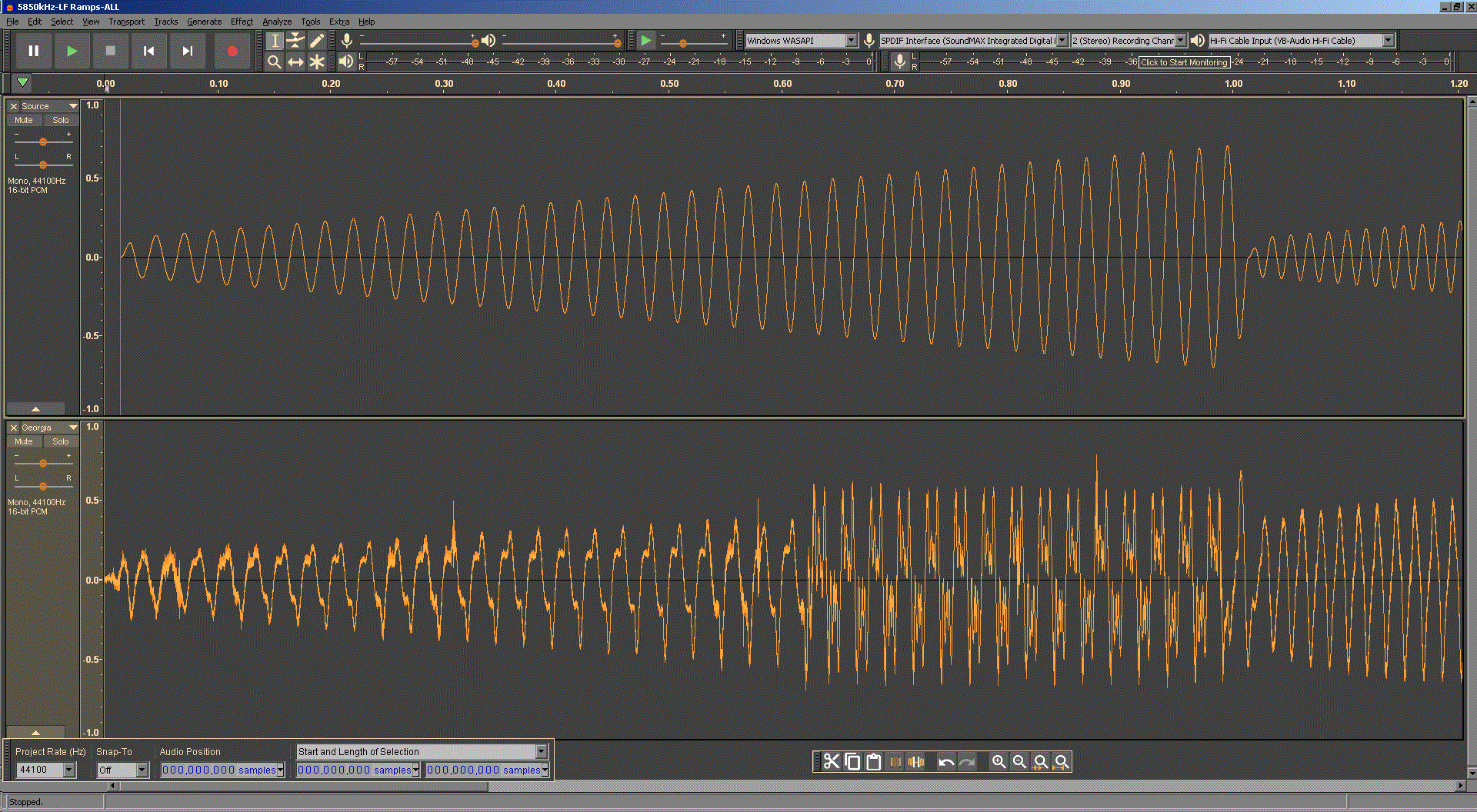 Above: Waterfall spectrum showing splatter (frequency doubling due to asymmetric distortion). Above: Comparison to a clean signal. |