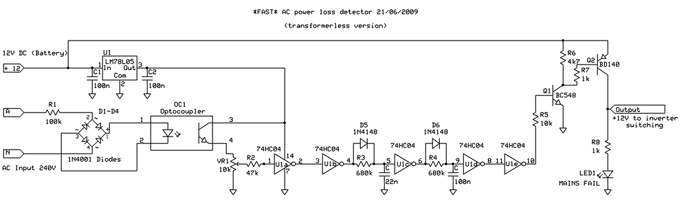 The AC loss detector is a simple circuit based on a CMOS inverter IC. It accepts 240 Volts AC, rectifies it, opto-isolates it, and squares the waveform to generate a series of pulses at double mains frequency. The pulses are typically > 5 mS long, and occur every 10 mS (twice per AC cycle). The pulse output is then processed by a 7 mS pulse extender (monostable) to stretch across the gap between pulses. A second pulse extender then smoothes the result to prevent chattering during marginal power conditions. As soon as the AC fails, or drops below the limit, the first pulse extender times out, thus detecting AC power loss within 7 mS. Placing R1 at the AC Active input limits both current and voltage. This allows low voltage diodes to be used, and also linearizes the LED transfer curve in the optocoupler.
