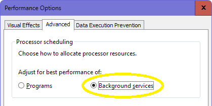 In "Processor scheduling", set "Adjust for best performance of:" to "Background services".