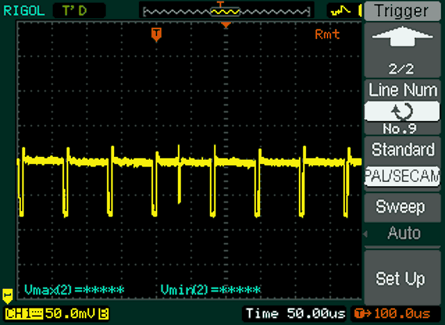 It was surprising just how stable the video output of a VCR is. The video line period was always very close to 64uS. Hardly any timing leeway was required in the software. It appears the main timing glitch comes from the headswitching, which can displace the field timing - making one field arrive early, and the other one late. This means those lines are long on one field, and short on the other! A function that automatically adjusts the vertical interval line lengths for minimal jitter still needs to be written.